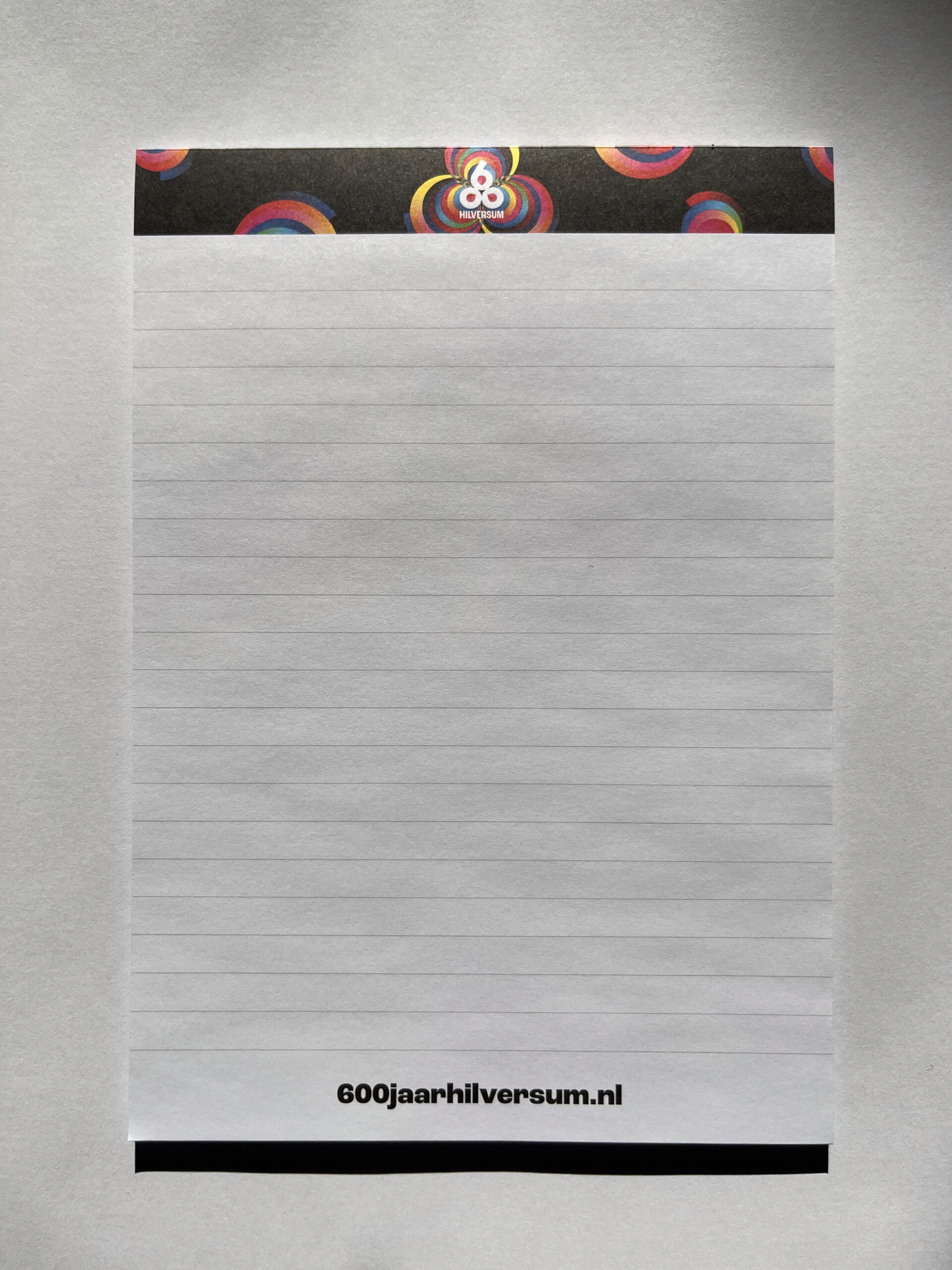 Vier de 600e verjaardag van Hilversum met dit A5-kladblokje! Met 25 vellen gerecycled papier is dit kladblokje perfect voor notities. Compact en handig voor onderweg. Bestel nu en vier mee!