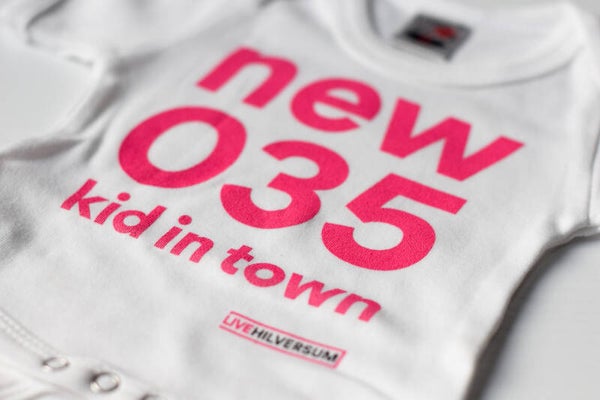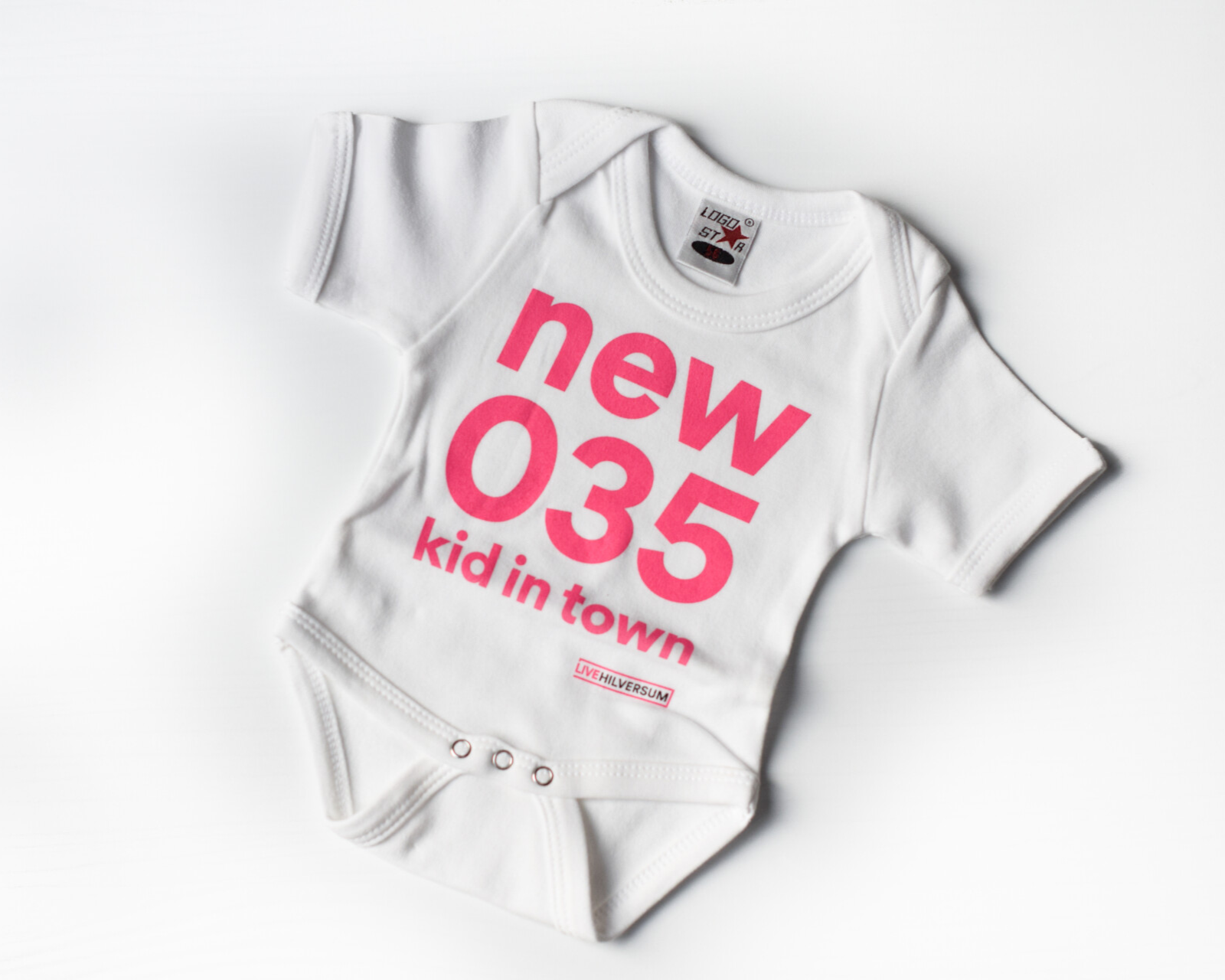 Verkrijgbaar in maat 50/ 56 of maat 62/68 met roze opdruk ‘New 035Kid in Town’